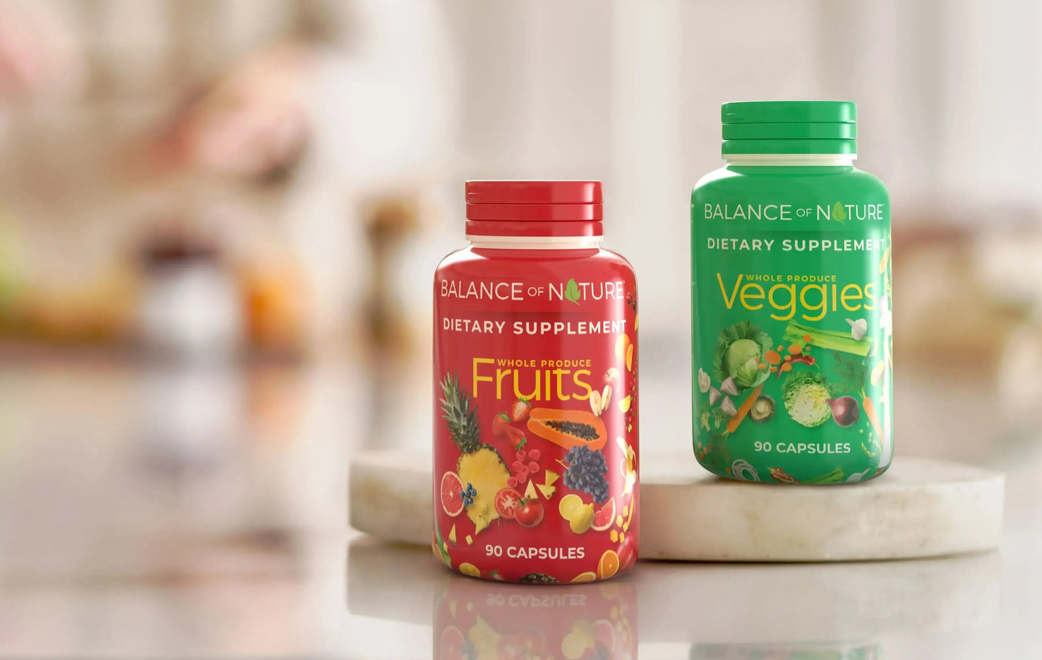 Balance of Nature Fruits & Veggies supplements are ingredients of whole fruits and vegetables. Our supplements are encapsulated, polished, counted, bottled, sealed, and delivered straight to your door.